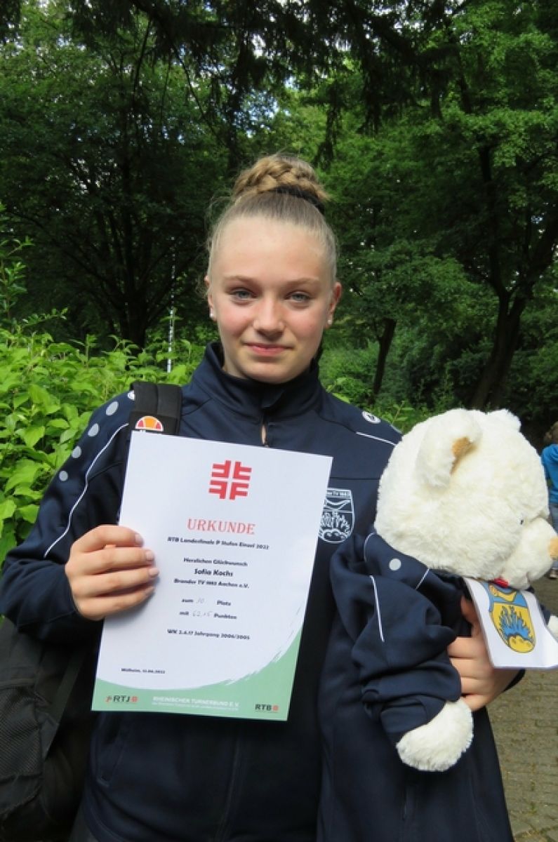 Durch ihre herausragende Leistung und dem wohl verdienten 2. Platz an den Regionalmeisterschaften-P-Einzel des Turngaus Aachen am 26.03.2022 in Monschau, sicherte sich Sofia Kochs die Teilnahme an der Turnverbandsgaugruppenausscheidung am 15.05.2022 in Monschau. Dort gelang es ihr, sich für das RTB-Landesfinale NRW zu qualifizieren.