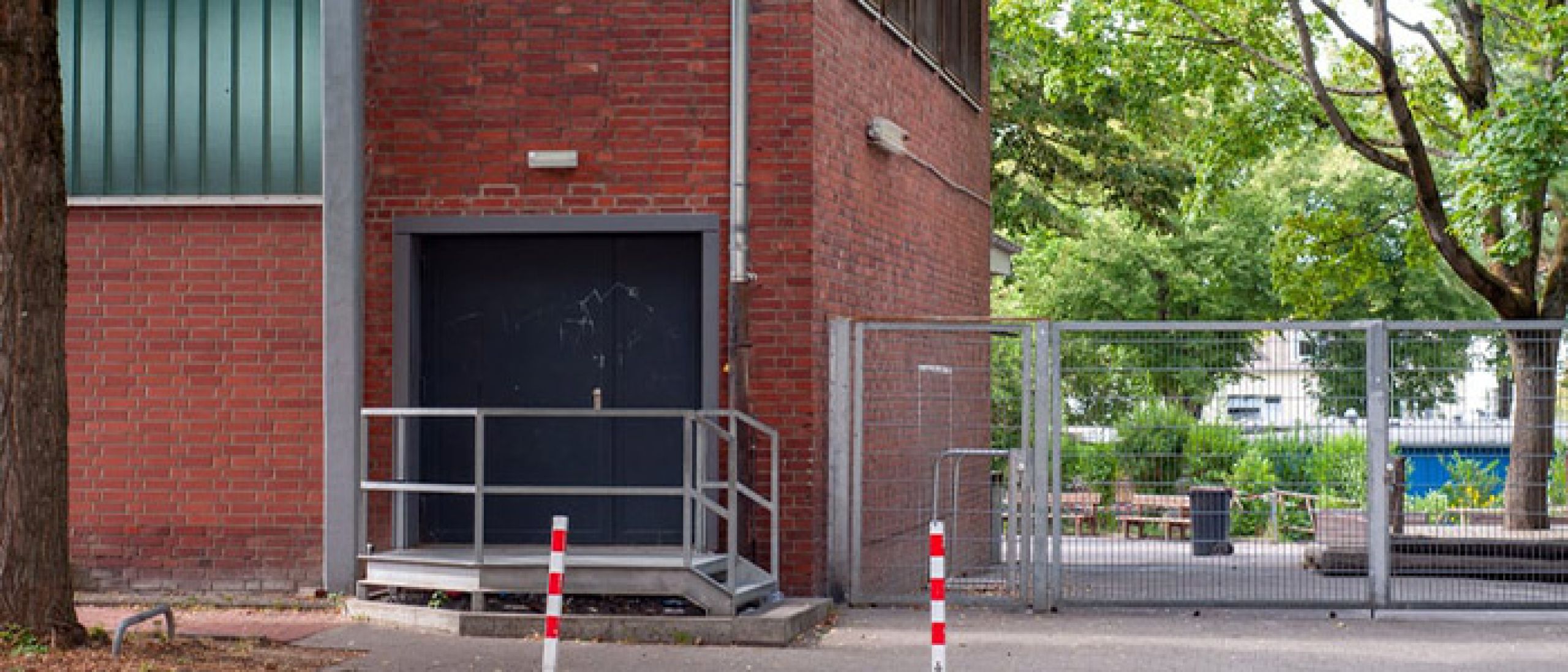 Der Eingang befindet sich an der Zeppelinstraße. Über das Tor neben der Halle gelangt man auf den Schulhof und folgt dem Weg nach links um die Halle herum zum Eingang.