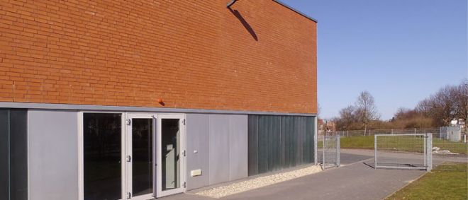 Die Turnhalle befindet sich rechts neben der Grundschule.
